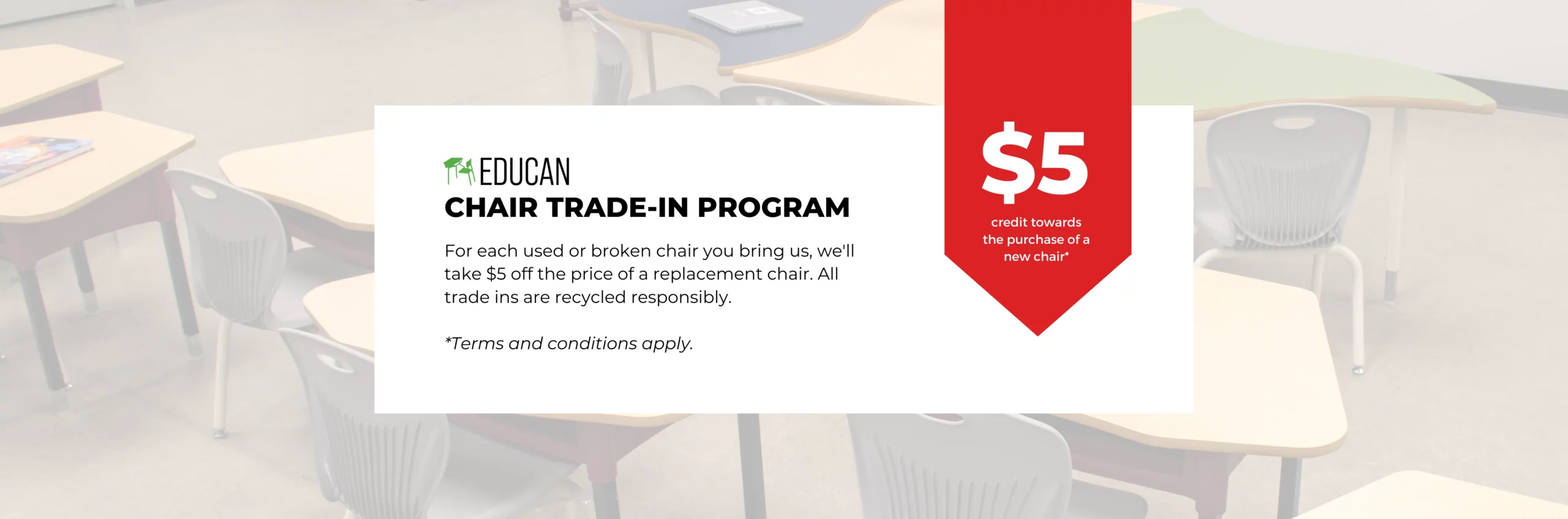 - For every chair turned in, Educan takes $5 off the next chair purchased (e.g. If a customer wants to purchase 100 new chairs and gives Educan 20 old chairs, they will get $100 ($5 X 20 new chairs) off their purchase).